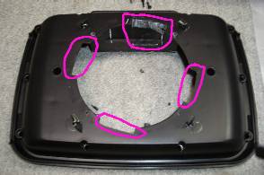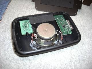![]() 裏フタを外すとこんなカンジ。 ちなみに裏フタは3ミリ厚ほどの鉄板で出来ていて、 どうやらアンプICのヒートシンクを兼ねているらしい。 見て判るように、スピーカーはダブルドライブ。 |